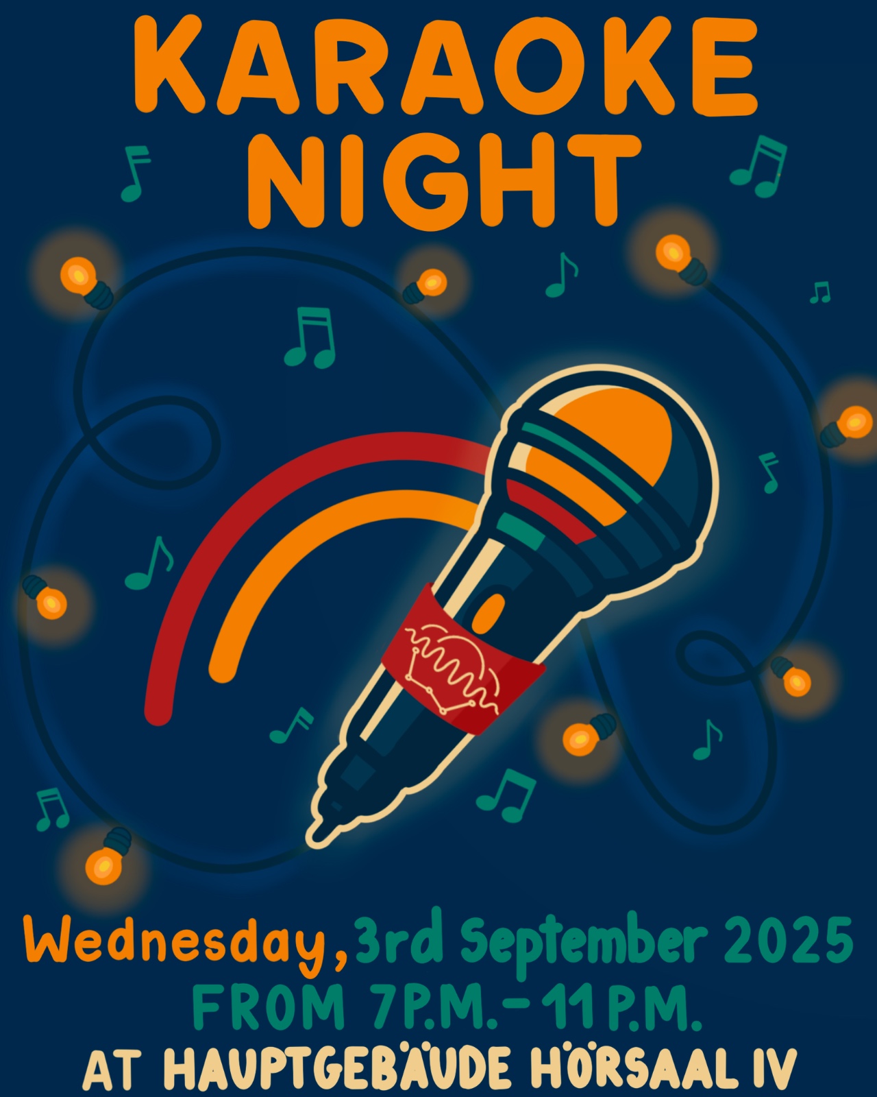 Of course, singing will continue during the exam period, so you can celebrate your successes or scream out your frustrations! The next karaoke night will take place on September 3, 2025, from 7:00 PM to 11:00 PM in Lecture Hall IV of the Main Building (Templergraben 55, 52062 Aachen)! π΅π Attention, room and time have changed this time due to the lecture-free period.